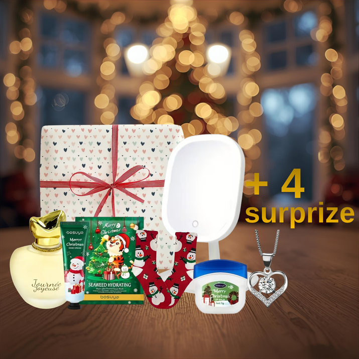 > Setul premium pentru femei conține un parfum, un set beauty (măști + cremă hidratantă), șosete pufoase, o oglindă LED, mini cosmetice, un colier și 4 surprize premium.