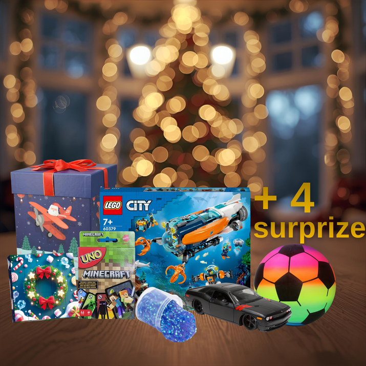 > Pentru copii, setul standard include o kendama, o mașinuță Hot Wheels, un LEGO și 2 surprize, iar setul premium conține un LEGO mare, un puzzle, jocul Monopoly, slime, un Hot Wheels și o minge Spiderman, plus 4 surprize premium.